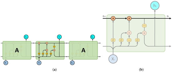 LSTM network. (a) The detailed structure within LSTM network; (b) LSTM transmission line.