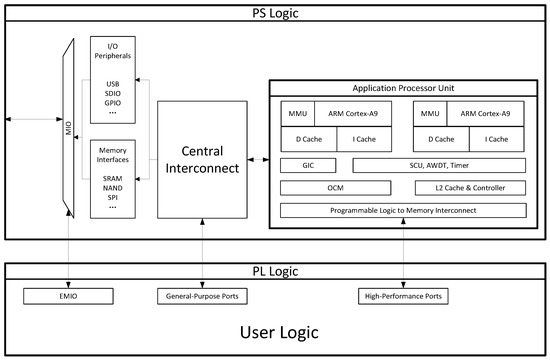Recent advances in silicon technology have enabled the integration of complex systems onto a single chip. Field Programmable Gate Array (FPGA) devices now consist not only of programmable fabrics, but also hard-core processors, dedicated processing blocks and various peripheral interfaces [32]. The PYNQ-Z1 is an open-source hardware platform that is part of the Xilinx Zynq System-on-Chip (SoC) devices. It offers a unique combination of programmable logic capabilities and processing power, integrating an FPGA with the dual-core ARM Cortex-A9 processor as shown in the functional block diagram of the Xilinx Zynq SoC presented in Figure 7. The PS refers to the dual-core ARM Cortex-A9 processor, while the PL refers to the FPGA fabric. One of the most advantageous features of the PYNQ-Z1 is its Python interface, which allows developers to communicate with PL from Python programs running in the PS. This feature provides a great opportunity for developers who want to implement hardware-accelerated applications like computer vision and machine learning applications. Both academia and industry have seen numerous researchers attempting to accelerate artificial intelligence or image processing operations using the Xilinx Zynq SoC devices. Refs. [33,34,35,36] have deployed various neural networks and achieved impressive optimization results.