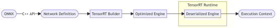 TensorRT is a software development kit (SDK) designed for fast inference. As shown in Figure 8, the TensorRT workflow involves the creation of an optimized inference engine builder module, which references network definitions. TensorRT is straightforward to deploy and is supported by NVIDIA through their TensorRT API. Unlike the deployment of the GPU version of TensorFlow, TensorRT automatically optimizes network models by merging network structures, allowing for more efficient parallel processing. In addition, TensorRT pre-copies network structures to the GPU to lessen the time required for subsequent inference, although this does result in a longer boot-up time compared to the fast boot-up times of CPU and GPU. Despite this drawback, the inference time of TensorRT is smoother and more stable compared to GPU, especially for the first 3–5 inference processes. The GPU is likely to experience unstable inference latency during this time, resulting in a significantly longer time spent compared to subsequent inference processes. On the other hand, the inference time of TensorRT remains consistent (with no significant difference between the first and subsequent runs).