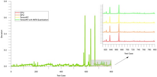 Figure 10 illustrates the deviation between the true and predicted values on the validation set. Meanwhile, Table 3 summarizes the average mean absolute error (MAE) and mean absolute percentage error (MAPE) values for different types, including PYNQ-Z1, CPU, GPU, TensorRT, and TensorRT with INT8. It can be observed that TensorRT did not affect the accuracy, while TensorRT with INT8 had a slight impact on the accuracy.