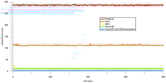 Figure 13 shows the inference time on the testing set. Meanwhile, Table 6 summarizes the average and median inference latency values for different types, including PYNQ-Z1, CPU, GPU, TensorRT, and TensorRT with INT8. The results show that the average and median inference time decrease significantly when using TensorRT and TensorRT with INT8 compared to other devices. Specifically, the median inference latency of TensorRT with INT8 is only 2.874 ms, which is much lower than the other devices.