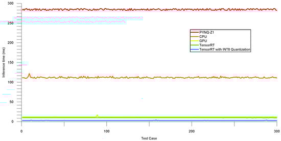 The validation set’s inference time is shown in Figure 12, while Table 5 summarizes the average and median inference latency across different approaches. The table compares the performance of PYNQ-Z1, CPU, GPU, TensorRT, and TensorRT with INT8. The results indicate that TensorRT with INT8 achieved the lowest inference time, with an average latency of 2.897 ms and a median latency of 2.874 ms, followed by TensorRT with an average latency of 9.807 ms and a median latency of 9.791 ms. These results demonstrate the effectiveness of using TensorRT with INT8 quantization for optimizing the model’s performance and achieving low inference latency.