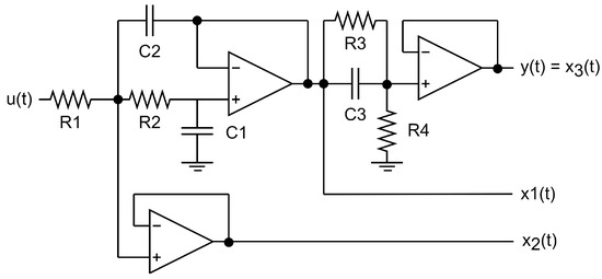 - Plant: a third-order plant with a zero was used in the experimental test. This plant was created using capacitors, resistors and the operational amplifier AD713JN. Figure 2 shows the schematic diagram of the plant. The signals , and are the state variables of the plant, which are sent to the analog-to-digital converters of the digital processor where the control algorithm is implemented (in this work, the processor is a dSpace DS1104). The transfer function of the plant is as follows:
