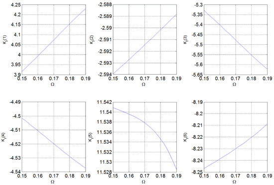 Figure 4 illustrates the elements of the gain matrix , which, for this application, forms a six-dimensional vector across different values used to train the MLP. Observe that the elements of are different functions of (linear, quadratic or more complex functions). For that reason, an MLP was used to estimate these parameters.
