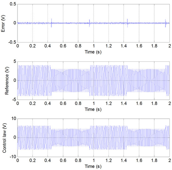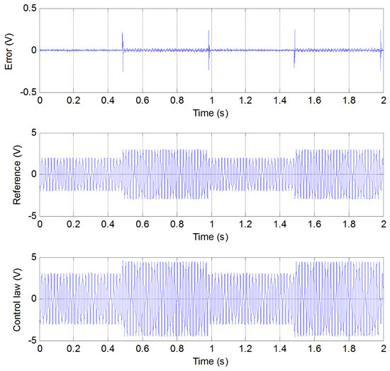Figure 5 and Figure 6 show the error, the reference and the control law for the two tests. In both cases analyzed, the steady-state error tends to be zero. The error spikes are expected because the abrupt amplitude and frequency reference change generates them. Furthermore, the proposed controller has a fast-tracking response, where spikes disappear. The abrupt change in the amplitude and frequency of the references produces spikes in the error curves. However, these spikes disappear quickly, proving that the proposed controller has a fast response.