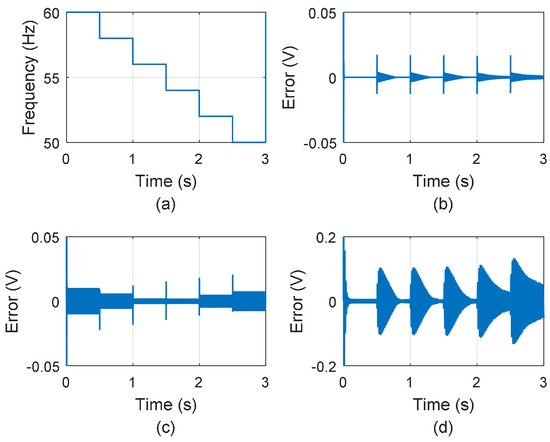 These techniques were tested through simulations performed in MATLAB 2021b. The sinusoidal reference with an amplitude of 2 V and a frequency that varies from 60 Hz to 50 Hz in steps of 2 Hz every 0.5 s. Figure 7 shows the errors for each controller. The proposed approach has the lowest error ripple.