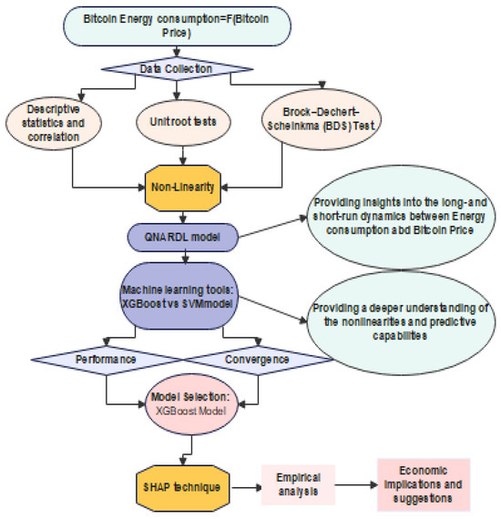 This study will employ a hybrid methodology that combines QNARDL and ML approaches to provide a more thorough examination of the correlation between consumption of energy and Bitcoin prices. While XGBoost and SVM techniques give a deeper grasp of the nonlinearities and prediction capabilities, QNARDL offers insights into the long- and short-term dynamics. Figure 1 shows how the QNARDL and ML models complement each other. First, the QNARDL model is useful for capturing nonlinear interactions between variables. By incorporating ML approaches, notably XGBoost and SVM tools, which excel at capturing complicated nonlinear patterns, the model may better reflect the intricate dynamics of Bitcoin prices and energy use. Second, ML approaches such as XGBoost and SVM models can improve forecasting accuracy by finding patterns and trends that standard econometric models may not detect alone. By combining QNARDL with XGBoost and SVM models, the model can make more accurate forecasts about Bitcoin energy use based on price variations. Furthermore, ML approaches are frequently more resistant to data fluctuations and can adapt to shifting market conditions. By merging QNARDL and ML techniques, the model can better handle the inherent volatility and unpredictability of Bitcoin values and consumption patterns. Third, policymakers and other stakeholders in the energy and cryptocurrency industries can receive improved decision assistance by combining QNARDL with ML approaches. It is possible to make well-informed decisions about infrastructure construction, resource allocation, and policy formulation to reduce the environmental effect of Bitcoin mining by properly forecasting energy usage based on fluctuations in the price of the cryptocurrency.