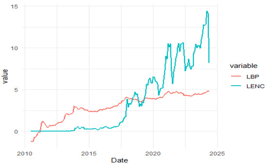 In this study, the variables are the estimated energy consumption (LENC) for mining Bitcoin daily in Terawatt–Hours (TWh) and USD market prices of Bitcoin (LBP) collected from https://digiconomist.net/ and www.bitcoinity.org/, accessed on 1 January 2023, respectively. All variables are expressed in natural logarithm which can reduce both the heteroscedasticity intensity and volatility excess. The spanning period is from 1 July 2010 to 1 December 2022, while the frequency of the observations is monthly. In addition to this, several symbols and notations are used in our study; they are included in Table 1. Table 2 donates the descriptive statistics. The Jarque–Bera test declines the null of normality for BEC and BP, hence, the quantile regression is appropriate. Moreover, our variables seem to move together in the long run given the high correlation result of 0.7799. Figure 2 illustrates the dynamic pattern of BP and the BEC index since 2010.
