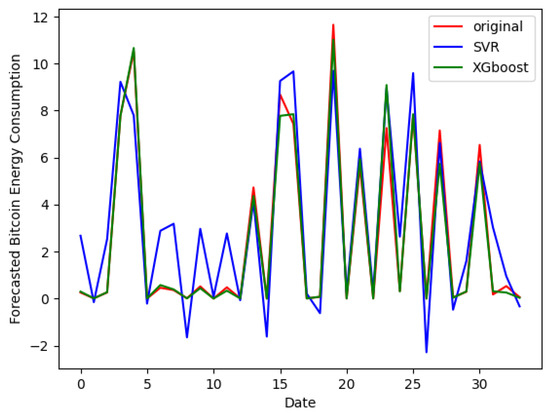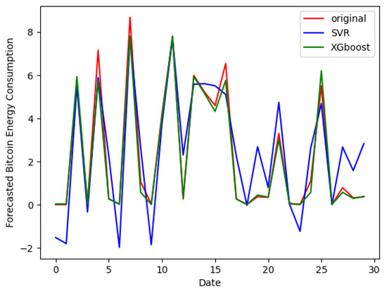 Now, we discuss the findings of the machine learning tools. We investigate the simultaneous effect of positive and negative shocks of BP on the BEC. This enables a deeper comprehension of how several shocks interact to affect BEC. Figure 3 plots the forecasted and observed values of BEC by comparing the SVR model against the XGBoost model on a validation sample. The plot indicates that the curve of the predicted series generated by the XGBoost model (green curve) closely aligns with the actual values (red curves), demonstrating its effectiveness in capturing the underlying patterns in BEC data. We highlight that the curve generated by the SVR model (blue curve) adopts a very different behavior compared to the curve of the actual values of BEC. This suggests that the XGBoost model outperforms the SVR model in terms of BEC forecasting accuracy. In addition, we report the ability of the XGBoost model as a machine learning tool to determine a good forecast of BEC, better than the SVR model. To summarize, our study shows that the XGBoost model outperforms the SVR model in terms of BEC prediction. This emphasizes how crucial it is to use cutting-edge machine learning techniques to raise the precision and dependability of energy consumption predictions within the Bitcoin ecosystem.