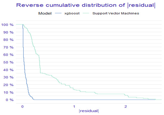 In terms of performance, the findings in Table 9 confirm the outperformance and dominance of the XGBoost model when compared to the SVR model. Empirical evidence exhibits that the assessments of performance metrics generated by the XGBoost model (RMSE = 0.72; MAE = 0.52) are smaller compared to those of the SVR model. In addition, the value of R2 of the XGBoost model is higher than that generated by the SVR model. Furthermore, Figure 4 plots the convergence of ML tools. It depicts the behavior of the “RMSE” cost function. We find that the XGBoost model achieves good root mean square error (RMSE) convergence compared to the SVR model. This means that the XGBoost model allows the cost function to quickly converge to the optimal solution. We also see that the RMSE convergence is more pronounced in the case of the XGBoost model than in the SVR model. This implies that, in terms of convergence, the XGBoost model is more efficient than the SVM model. We complement the analysis by focusing on the features of the XGBoost forecasting tool. The SVR model is discarded from the feature assessment since it is less effective and good compared to the XGBoost model.
