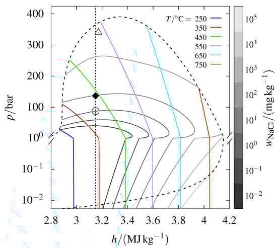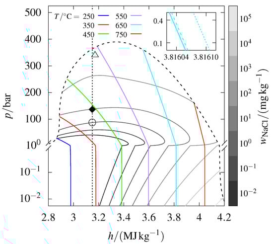 Pressure–specific enthalpy diagram for the – system, calculated using the equation of state of Ellingsen and Haug-Warberg []. The diagram features isotherms ranging from 250 to °C (colored lines) and isopleths for the solubility of sodium chloride in water vapor from to (gray lines). These are delimited to pressures below the vapor–liquid–halite coexistence curve (dashed line). Five isotherms corresponding to of every order of magnitude ranging from to are plotted, but these are visually indistinguishable in the main figure. The inset provides a zoomed-in view of the low-pressure behavior of the isotherms at °C, with the rightmost isotherm corresponding to . The solid diamond corresponds to a sample from the wellhead of the IDDP-1 well [], and the open circle is where precipitation sets in for isenthalpic decompression along the dotted line. The open triangle marks an estimate of the downhole conditions of the IDDP-2 well. Further details are provided in the main text.