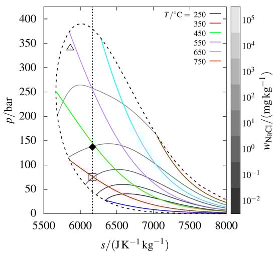 As mentioned in the main text, the convention of the IAPWS is used in Figure 1 and Figure 2. Specifically, the specific internal energy and specific entropy of both saturated liquid water and halite are assigned a value of zero at the triple point of pure water. At the triple point, the temperature is by definition , while the pressure () and the specific volume of the liquid phase () can be calculated from the IAPWS-95 EOS [,].