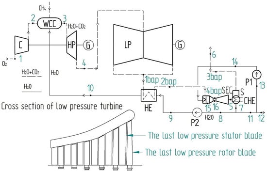 In addition, advancements in various cooling techniques, such as the injection of water or steam into the combustion chamber, are making it increasingly feasible to realize combustion in a stoichiometric mixture of fuel and oxygen with water cooling [33]. This study presents the optimization of the final stage of the turbine in a Brayton double cycle employing an oxy-fuel combustion plant. The system in Figure 1 is characterized by three devices: a wet combustion chamber (WCC), a spray ejector condenser (SEC), and the high and low parts of a gas–steam turbine (HP + LP).