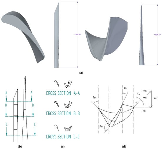 The performance of the turbine stage is affected greatly when the assumption of a uniform channel height across the radius is disregarded [38,39]. The flow conditions vary with the radius of the last stage division, and, to enhance the efficiency of the turbine, the blade shape needs to be altered to adapt to these changes [19]. This is achieved by altering the inlet (α) and outlet (β) angles to match the fluctuating circumferential speed u. The process of adjusting the blade shape is referred to as twisting and is performed using the free vortex method, as described in detail in Reference [40]. In addition, the work will also refer to Professor Szewalski’s proposal [41,42,43] in the future.