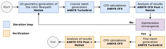 To acquire a new shape, the method of linear extrapolation (with fixed parameters) was employed, facilitating the lengthening or shortening of the rotor blade. The introduced collaborative parallel algorithm is a composite of particle swarm optimization and the Nelder–Mead method, termed HNMPSO. In this method, the algorithm initiates with a randomly generated initial population. The entire population is sorted based on their fitness (value of the objective function). The optimal solutions are inputted into the deterministic algorithm to enhance the rank solution. The suboptimal solutions are diverted to the PSO method. The subsequent stage involves the standard procedure for the particle swarm optimization algorithm. In summary, the architecture of this hybrid algorithm circumvents stagnation and enables the potential construction of a simplex, encompassing several locally distinct minima. The comprehensive optimization procedure encompasses two stages—iteration and verification (Figure 3). Every aspect of the iteration loop is overseen by a script developed in the Matlab R2021a environment. The geometry of the optimized stage is formulated within this Matlab script. An automatic grid was established using the ANSYS TurboGrid 2021 R1 software.