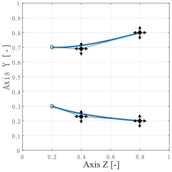 The parameterization of the last 3D axial stage was based on changing the rotor meridional contour. The idea of endwall contouring is pursued in LP turbines with diverging contours to ensure a smooth flow at the endwalls and to induce a streamline curvature that reduces the gradients of the flow parameters downstream of the stator [44]. In this paper, 3th order curves describe the geometry of meridional contours by two B-splines. The 4 parameters for the lower endwall and 4 for the upper endwall were implemented for the optimization. Figure 4 demonstrates that each parameter varies in a prescribed range. Due to modifying the meridional contours of the flowpath, the height of the rotor blade changes. By reaching a new shape, the linear extrapolation is used, which allows the rotor blade to be shortened or lengthened, respectively.