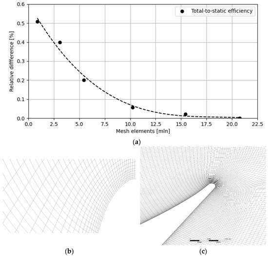 To perform simulation properly the discretization of the analyzed domain must be gained correctly with the inclusion of crucial elements. Thus, the hexahedral mesh has been selected, as one that provides excellent accuracy and a relatively low element count. Figure 5a illustrates the relative maximum difference values of total-to-static efficiency for the analyzed computational meshes, compared to the reference values obtained from the mesh with the largest grid cell count. Differences in efficiency below 0.1% are already visible in a mesh consisting of about 10 million elements. Further increases in mesh size result in a slight decrease in the efficiency obtained. To achieve high-quality results, a mesh of over 20 million elements was used, where the percentage error in efficiency between the previous and current mesh sizes dropped below 0.05%.