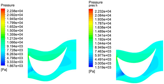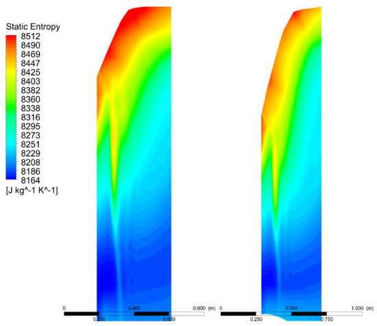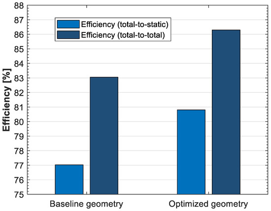 Figure 6 presents the final values of the efficiency. Nevertheless, Figure 7 shows the comparison of the total-to-static and total-to-total efficiency of the stage with respect to Equations (11) and (12). The outlet loss (or exit velocity loss) is connected with the unused kinetic energy of the fluid. It is defined as , where is the turbine’s exit velocity. In particular, the areas of the rotor fluid achieved a higher velocity because of the more optimal flow distribution, but, as a result of the optimization, there was a reduction in the average velocity at the stage exit. Thus, the outlet loss was reduced by 5.88 percent. The static entropy, which represents losses, is presented in Figure 8.