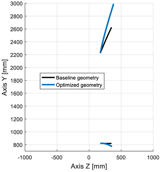 The geometric changes between the baseline and optimized turbine stage are illustrated in Figure 9. As a result of the changing endwall contours, the flowpath exit area from the rotor passage was increased in the optimized design. The optimization algorithm plays a crucial role in the design process of turbine flow channels by determining the optimal geometric parameters that can enhance the turbine’s performance. This algorithm systematically adjusts various geometric characteristics to maximize the efficiency and minimize energy losses. Once the optimization algorithm identifies a promising set of geometric configurations, these configurations are then translated into detailed geometrical models of the turbine. These models serve as inputs for computational fluid dynamics (CFD) simulations, specifically conducted in sophisticated software like ANSYS CFX 2021 R1. The interplay between the optimization algorithm and CFD calculations is iterative. The initial results from the CFD simulations can be fed back into the optimization algorithm, prompting further adjustments to the geometric parameters to refine the design. This iterative process continues until the optimization converges on a design that meets the desired performance specifications, effectively balancing the efficiency, durability, and cost. Finally, the end of the lower endwall moved from 820 mm to about 770 mm. The upper endwall was changed significantly; the exit radius increased to 3000 mm. All changes and optimization boundaries are presented in [10]. Thus, this change in channel is more optimal from the point of view of the flow distribution, but the rotor blade would have to withstand higher centrifugal forces. Because of this, the blade should be checked in the next iteration of the stage design, which is the mechanical strength finite element simulation. Such analyses, along with stress optimization, are possible whether for pumps [63] or turbines [64,65].