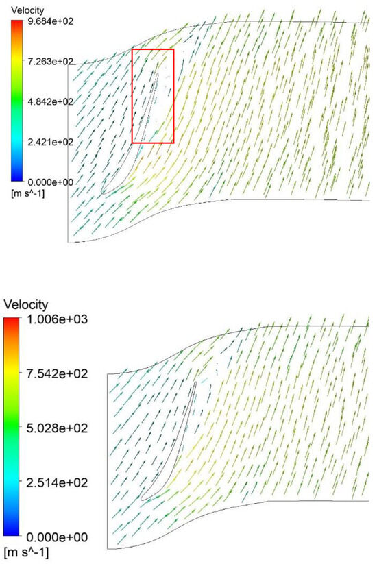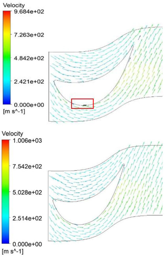 Velocity vectors in the rotor at the hub: original design (above), optimized design (below). The marked area shows separation in the form of velocity vectors (in the red square).