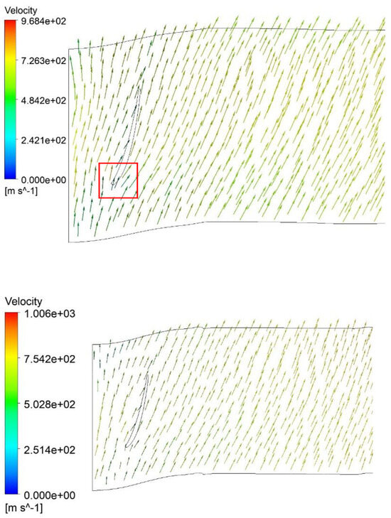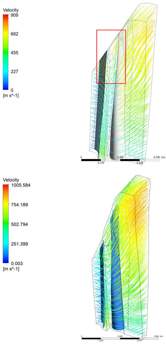 The velocity vectors at the mid-span were also slightly improved (Figure 11), even though the area where the shape optimization took place was at the hub and the turbine’s inner casting (shroud)—see Figure 12. The area of flow separation at the mid-span was significantly reduced. The higher area of the blade was under the correct pressure and could generate momentum. The reason that the flow separation was still present after the optimization process was that the blade shape itself was not changed during the simulations. The area of flow separation was also reduced at the shroud. Figure 13, Figure 14 and Figure 15 present the Mach number. The Mach number and velocity achieved higher local maxima, which led to increased pressure differences at both sides of the blade, which contributed to the increase in the stage efficiency. The average velocity at the outlet was lower after optimization. The streamlines in the baseline design (above) and optimized design (below) are included in Figure 16. This figure confirms the improved flow with the decreasing vortex structures. Based on the presented results for the velocity vectors, Mach numbers, and streamlines, it should be concluded that the flow is clearly turbulent. As indicated in the Methodology, a laminar model is unnecessary and focusing on turbulence models is more appropriate to accurately simulate such flow dynamics. The Reynolds number ranges from 16,544.4 at the hub to 39,944.4 at the shroud. The characteristic length was assumed as the distance between the blades that gave the lowest value of the Reynolds number. Therefore, all calculated values are well beyond the pipe transition value of 2300 and there is a turbulent flow.
