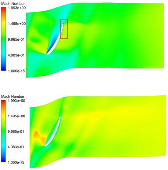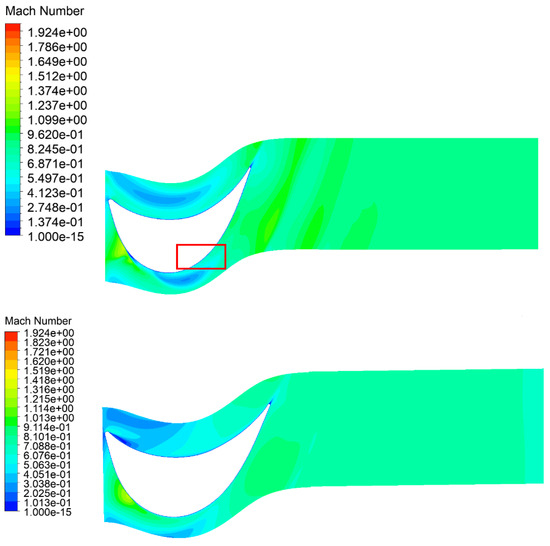 Mach number in the rotor at the hub: baseline design (above), optimized design (below). Visible separation of the fluid from the blade on the suction side in the form of a pressure drop (in the red square).