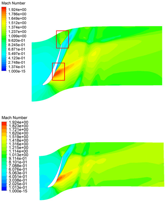 Mach number in the rotor at the mid-span: baseline design (above), optimized design (below). The red squares show a shock wave forming on the suction side and significant breakaway at the trailing edge, causing flow losses.