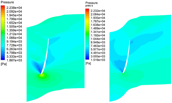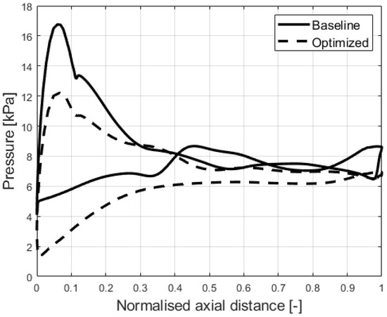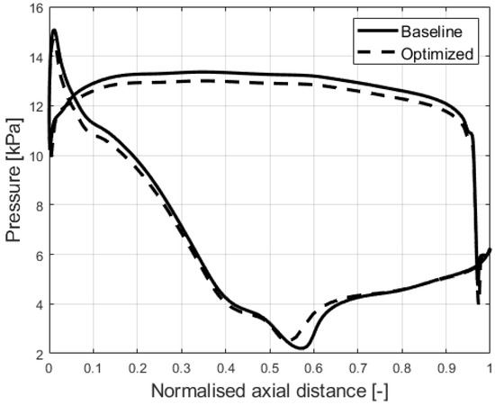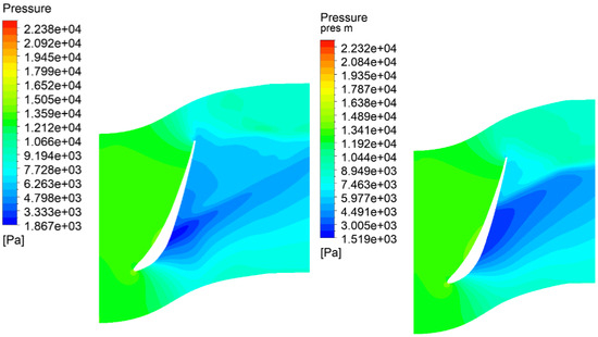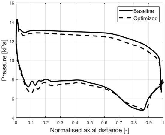 The loading profiles at the hub, at the mid-span, and at the shroud are presented in Figure 17, Figure 18 and Figure 19. It can be observed that the average pressure difference is increased. The largest improvement can be observed at the shroud (Figure 19). The pressure fields are presented in Figure 20, Figure 21 and Figure 22. Improved pressure fields can be seen, especially at the shroud in Figure 22, where the high-pressure area at the lower-pressure side of the blade is reduced. This change mostly leads to increased stage efficiency after optimization.