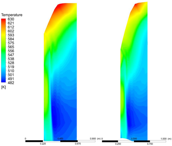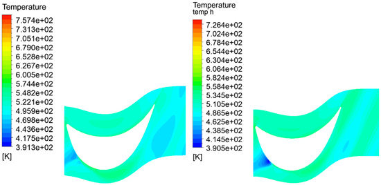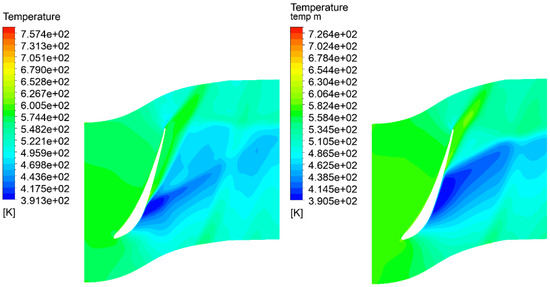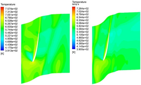 The temperature fields are presented in Figure 23, Figure 24, Figure 25 and Figure 26. The temperature at the last stage does not drop to the value of the saturation pressure of steam at a given pressure. However, this phenomena occurs in conventional steam turbines [66,67,68]. The key thermodynamic phenomena occurring in the flow of a gas–steam turbine concern the behavior of the mixture of fluids as the pressure drops during the transfer of mechanical energy to the turbine stages. As a result of the drop in enthalpy, the temperature also decreases, and the more efficient this process is, the lower the temperature obtained at the turbine outlet. However, the ratio between steam and carbon dioxide also affects the temperature decrease during this process, and it becomes apparent that a gas–steam turbine has smaller temperature decreases than a pure gas turbine. However, the advantage of the gas–steam turbine is that the thermodynamic expansion process can also be carried out to vacuum through the use of a condenser. In this case, the temperature can drop even to near-ambient values. However, the fluid dynamic phenomena occurring in the gas–steam mixture as it expands through the turbine stage is the same as in a classical steam turbine in superheated steam. Thus, droplet condensation would not occur in this type of turbine. An improvement in the temperature can be observed, especially at the rotor contours (Figure 23 and Figure 24), where a larger drop in temperature due to expansion can be observed. Simulations of the temperature fields can be used to compare them with measurements that allow the determination of the performance deterioration [69,70].