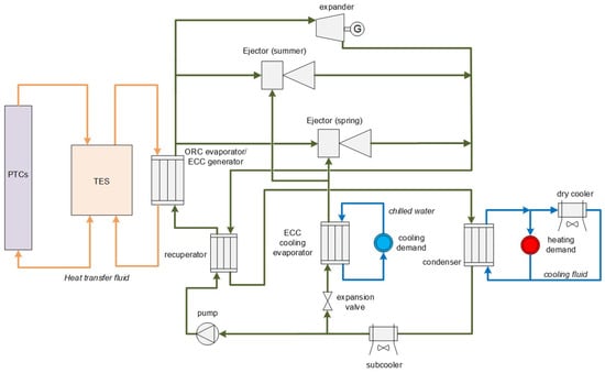 Finally, as for the limitations of the study, both the buildings’ heating, cooling and electricity loads and the thermal power production from the PTC field were calculated from simulations based on typical meteorological weather data rather than utilizing actual measurements from both the buildings and from an existing PTC system. The latter could provide more realistic results regarding the energy and economic performance of the system. Moreover, in the calculations, the off-design operation of the trigeneration system, e.g., the part-load operation of the ORC-ECC’s pump or expander, was not considered. Thus, regarding future work, a pilot implementation of the proposed system in a building would provide measurements, allow a more realistic calculation of the system’s performance and reveal the most important technical challenges of the system’s implementation. Moreover, regarding the ORC-ECC, the techno-economic performance of a trigeneration system with a high-temperature ORC-ECC, which would better exploit the high temperature of the PTC field and could achieve a higher thermal efficiency and COP, should be investigated. It must be mentioned that the methodology that was described and implemented in this study could be replicated for the case of different regions, by considering the weather data, typical building characteristics and economic environment of the region. Therefore, an investigation of the system’s techno-economic performance in different regions, as well as for different building types, e.g., hotels, multi-family houses or district heating applications, would allow the assessment of the potential of the proposed system to contribute to the decarbonization of the building sector. Finally, the methodology that was presented in this study could be implemented for the assessment of the techno-economic performance of other novel energy technologies.