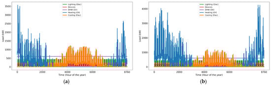 The results from the dynamic BEM regarding the buildings’ loads, developed using EnergyPlus, which were retrieved in the form of loads per end use on an hourly basis for a whole year for the office and the hospital building, are presented in