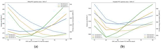 Figure 8, which show that a smaller ORC size and a large TES size result in more beneficial economic indicators in both buildings. Nevertheless, the cost-optimal PTC size and absolute ORC and TES size were different. The increase in the PTC area was not beneficial for the office (see