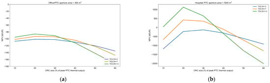 Figure 7), due to the building’s high loads. That resulted in acceptable economic indicators at larger PTC sizes. Overall, considering the minimum PTC size, it can be concluded that the integration of the proposed system in buildings with higher loads would be more beneficial. Furthermore, regarding the effect of the two parameters, it was shown that even if the surplus heat were fully utilized, the economic indicators would remain unacceptable, even though they would be improved (see
