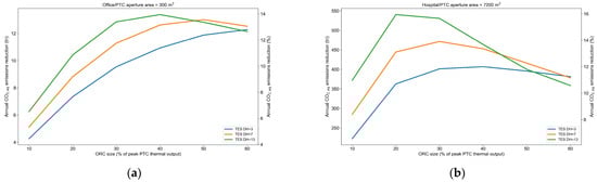 Figure 9) is inversely proportional to the PEC reduction, as expected, and is higher for higher TES capacity. A maximum of around 14% and 16% emission reduction is observed for the office and the hospital building, respectively.