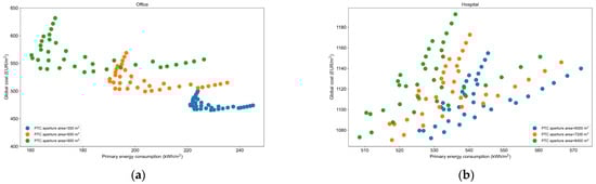 Figure 10, the GC-PEC plots for the two buildings are presented for indicative consecutive values of the examined PTC sizes. For a specific PTC size, the variation of the GC and PEC that was presented in