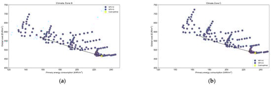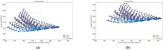 Figure 11. The optimal scenario in both CZs is observed for the lowest examined PTC size, as expected. Moreover, in all examined scenarios, the NPV is negative, suggesting a non-viable investment. Regarding the comparison between the CZs, in CZ C the points are shifted towards higher PEC and GC values, due to the higher PEC of the building in CZ C. Other than that, the variation of the points is similar in the two CZs. In addition, in