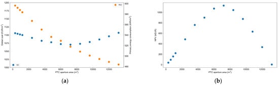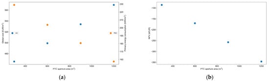 Figure 14, the GC and PEC and the NPV of the scenario with the minimum GC for each examined PTC field aperture area are presented. As the PTC size increases, the GC initially decreases, reaching its optimal value for a PTC size of 7200 m