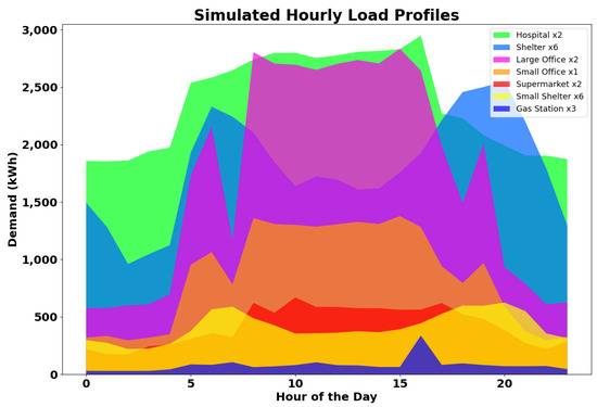 The set of facilities consists of different buildings, each with varying energy profiles over the course of a day (see Figure 2). The total demand over an hour h is determined by Equation (13), and thus, the difference between the expected load and supply determines if there is a cost for buying power or profit for selling excess power (Equation (14)). When is negative, supplemented power must be purchased from the grid at the current cost of energy , and when it is positive, the ability to sell the excess energy back to the grid arises.