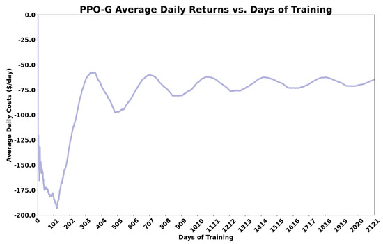Average daily costs (returns) during training of the PPO-G. This plot visualizes the agent improving the EM policy during training.