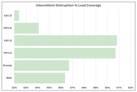 The final set of tests tasks the methods with optimizing demand coverage with randomized week-long disruptions each month of the testing. The results are displayed in Figure 6. When tasked with providing demand coverage when the energy grid connectivity is uncertain, the grid-connected trained models vastly outperform the other methods. For the intermittent connectivity issue scenario, the models trained with disruptions perform starkly worse than in the isolated case where they are at the upper end of load coverage capability. It seems that the models trained only on grid-connected scenarios do a good job of handling the few hours a month where the grid connection fails. In contrast, the models trained with intermittent disruptions match or exceed the performance of the former methods at handling the isolated scenarios, with the A2C-D method outperforming all others.