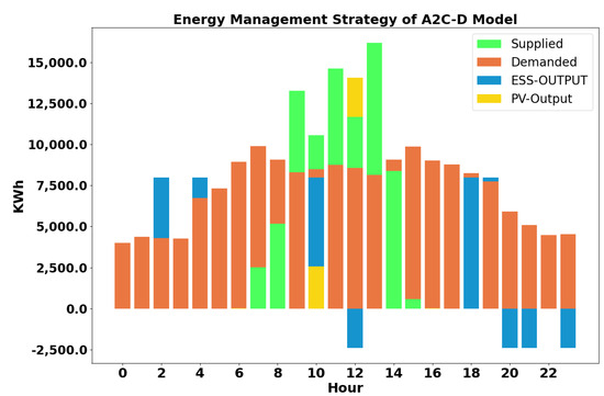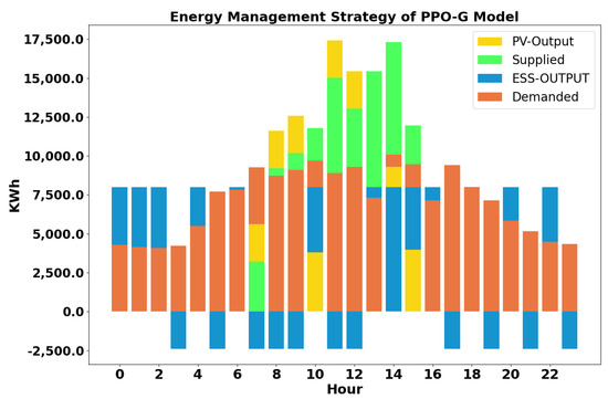 During each simulation, the energy output of the PV and ESS unit is tracked alongside the energy demands at each hour and the costs or profits generated. Analyzing the discharging and charging behavior exhibited by the RL agents can provide insights into the logic, if any, behind the learned policies. Figure 7 visualizes the energy output for the ESS and PV units, the total supplied energy from the two sources, and the energy load for each hour of a simulated day based on the policy derived from the PPO-G model. Hours with the top color in blue, such as hours 0–2, indicate that the ESS unit is the sole energy source, discharging and supplying more than needed. When the green bar is at the top, the combined power from the ESS and PV units is more than sufficient to meet energy demands. If the yellow PV bar is above the green bar, it signifies that the ESS is being charged by the PV unit, thereby reducing the total energy supplied. In a grid-connected scenario, the EMS model allows the ESS to provide supplemental energy outside sunlight hours, charge during sunlight hours, and generally meet demands. It also generates the most excess energy during peak PV output hours, producing profits for every kWh exceeding demand. During the pre-sunlight and post-sunlight hours, the model utilizes the ESS in varying ways (blue top bars). The early morning hours between midnight (hour 0) and 6 AM show that the model had stored enough energy to provide three consecutive hours of load coverage, with the following intervals of charging and discharging. This behavior provides as much constant energy as possible until the ESS is depleted, followed by alternating actions to provide some load coverage whenever the ESS is able to. Once the PV can provide energy after 6 AM, the PPO-G-based policy sees the ESS mostly either charging consecutively (blue bottom bars) at no cost using the PV unit or providing supplement energy during the tenth and thirteenth through fifteenth hours. It should be noted that the peak demand and energy cost hours are between the fourteenth and twenty-first hours of the day. Looking at the figure, it can be seen that this is when the most consecutive discharges occur, leading to the required load being exceeded by the energy supplied, leading to the highest potential profits. From these results, it seems that the model learns to store energy consecutively during the sunlight hours while preferring to charge cyclically when the cost-free energy provided by the PV unit is unavailable. In addition, the model seems to prefer achieving profits by providing excess energy during peak energy price times based on the availability of PV energy. Thus, the policy produced by the PPO-G model can provide decent load coverage during the low sunlight hours while also providing actions that provide profits that help offset the costs incurred when the PV energy output is insufficient.