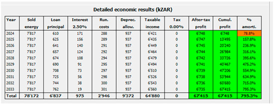 Removing taxes and subsidies of about ZAR 35,000, the Net Investment (CAPEX) is ZAR 9,336,500.00. This means that approximately ZAR 10 million are required for this investment. The Figure 9 below outlines the detailed economic results of the system.The investment will be funded through a combination of equity investment, a bank loan, and government incentives, with the total investment amounting to ZAR 10 million, as shown below.