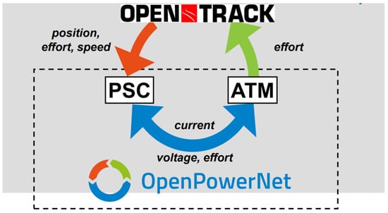 The trains and track are modelled in OpenTrack simulation software while the power system is modelled in OpenPowerNet simulation software. The main modules of OpenTrack are shown in Figure 1, where it shows three modules, rolling stock, infrastructure, and timetable, that should be entered by the user. The simulation is performed by continuously solving the differential equations representing the train’s movements that are combined with discrete signal information. OpenPowerNet is a simulator that is developed as an extension of OpenTrack. The two simulators interact during the simulation where OpenTrack simulates the course operation control and the driving dynamics while OpenPowerNet simulates voltages of the electrical network with respect to the course current consumption and position. Then the engine in OpenPowerNet simulates the requested current and achieved effort with respect to the available line voltage at the course position. The simulation philosophy is explained in Figure 2, where the advanced train model (ATM) simulates the propulsion and auxiliary systems. The ATM also calculates the train’s current demand when the power supply calculation (PSC) feeds into the tractive/braking effort. If the PSC feeds into the train’s current demand, the ATM calculates the tractive/braking effort. It is worth mentioning that the trains are modelled as current sources. Screen captures of the OpenTrack and OpenPowerNet simulation tools are shown in Figure 3 and Figure 4, respectively.