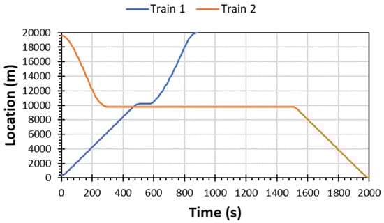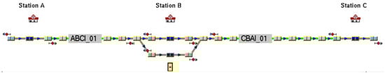 The representation of the modelled railway track system is shown in Figure 5, where there are three passenger stations (the place where the trains load and unload passengers) and two running trains. The alignment, gradients, curvature, speed limits, occupation constraints of tracks, and signalling are defined within the track infrastructure in the OpenTrack simulation tool. The total length of the railway track is 20 km where Station A is located at 0 km, Station B is located at 10 km, and Station C is located at 20 km. The train diagrams are shown in Figure 6 and the timetable is presented in Table 2. Train 1 travels from west to east while Train 2 travels from east to west. The trains are supplied by DC traction where the maximum tractive/braking power is 5560 kW and the auxiliary power is 100 kW. The trains are equipped with onboard ESSs that are 50 kWh in size and charge and discharge with a maximum power of 2000 kW.