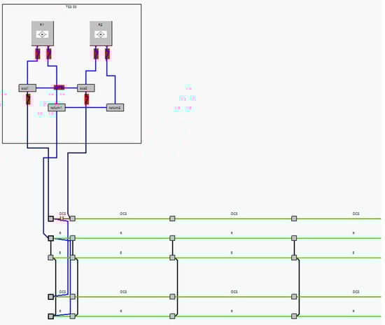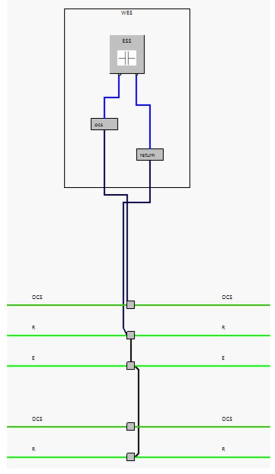 There are two traction substations. Substation 1 is located at 0 km while Substation 2 is located at 20 km. It is decided to locate substations at the passenger stations except for the middle, where there is a passenger station without a substation in order to simulate both practical cases. Further, this assumption allows for the analysis of the impact of stationary ESSs when they are located in the middle of two substations. The substations are rectifiers, meaning that the power is unidirectional. However, they could be supported by renewable energy sources. The substations have a no-load voltage of 3.3 kV and an internal resistance of 10 mΩ. The power lines are formed of contact wires with a resistance of 65.8 mΩ/km and a return conductor rail with a resistance of 15.3 mΩ/km. Figure 7 shows the modelling approach of the substations and power lines in the OpenPowerNet simulation tool. It is worth mentioning that the power lines are divided into slices that directly affect the size of the calculation matrix and analysis speed. There are conductors that are perpendicular to the track and connected at the slices’ locations. These are called connectors and they are used to analyse the data between different conductors. In this study, the distance between slices is set to 500 m, which depends on the size of the network, the length of the line, the number of conductors, and the speed of the trains. The leakage between the rail and the earth is modelled along the line.