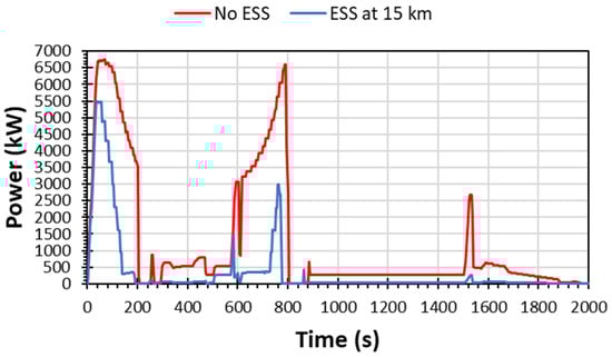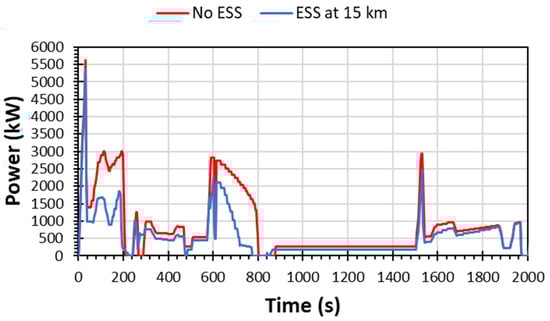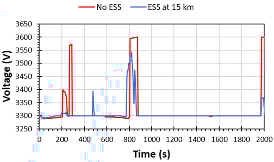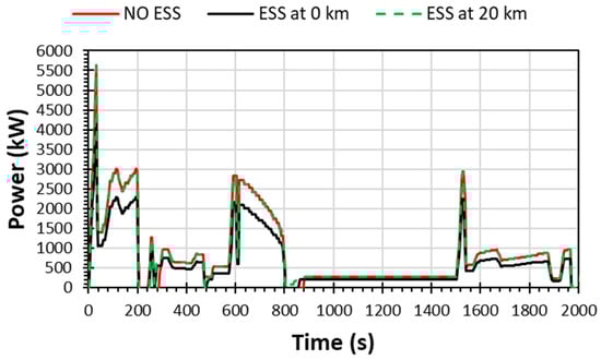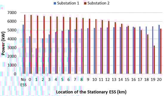 It is noticed in Figure 16, Figure 17, Figure 18 and Figure 19 that the power and voltage profiles of the substations reduce significantly when placing the stationary ESS at the location of 15 km. The peak power of Substation 1 reduces from 5624 kW to 5378 kW (4.37% reduction) while the peak power of Substation 2 reduces from 6754 kW to 5493 kW (18.67% reduction). The average of the peak-power reduction of the two substations is 12.17%. The impact of the stationary ESS on the substation’s peak-power reduction is high because the ESS charging voltage setpoint is very low, above 3.3 kV (the substation has no-load voltage). The impact on Substation 2 is significantly higher than that on Substation 1 because the ESS is installed at 15 km, which is closer to Substation 2 than to Substation 1. Further, when locating the stationary ESS at Substation 1 (0 km), the peak-power demand of Substation 1 reduced from 5624 kW to 4308 kW (23.4% reduction) while the peak-power demand of Substation 2 reduced from 6754 kW to 6748 kW (0.09% reduction). When locating the stationary ESS at Substation 2 (20 km), the peak-power demand of Substation 1 reduced from 5624 kW to 5607 kW (0.3% reduction) while the peak-power demand of Substation 2 reduced from 6754 kW to 5178 kW (23.3% reduction). Therefore, it is evident that the impact of the stationary ESS on reducing the substation peak-power demand is highly related to the location of the ESS installation, see Figure 20 for further details.