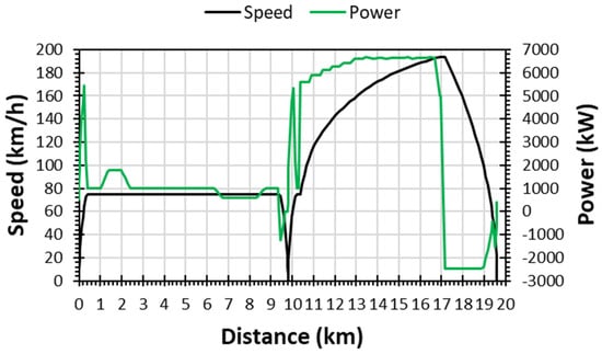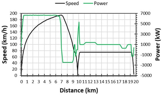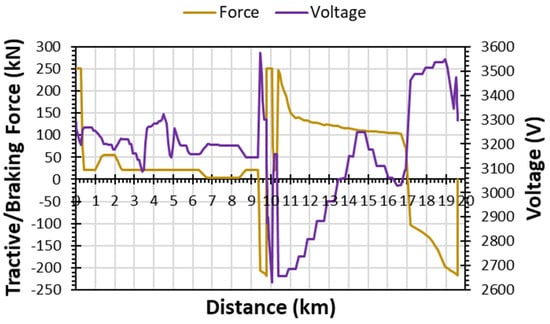 The tractive/braking force, voltage, speed, and power of Train 1 and Train 2 are shown in Figure 12, Figure 13, Figure 14 and Figure 15. The sections between passenger stations are divided into speed segments, where the speed limit between Station A and B is 200 km/h while it is 75 km/h between Station B and C. The trains run in a driving style known as flat-out operation, where the trains try to achieve the target speed limits with respect to constraints such as maximum acceleration, minimum safe distance between consecutive trains, allowable travel time, and passenger comfort criterion. Train 1 travels from west to east in 14 min and 16 s. The energy consumed by a vehicle at the pantograph increases from 430 kWh to 468 kWh after installing the stationary ESS. However, energy recovered by the catenary system at the pantograph increases from 11 kWh to 48 kWh and the degree of consumed energy regenerated at the pantograph increases from 3% to 10%. Further, the energy losses in the braking resistors decrease from 23 kWh to 0 kWh. Train 2 travels from east to west in 33 min and 25 s. The energy consumed by a vehicle at the pantograph increases from 612 kWh to 638 kWh after installing the stationary ESS. However, energy recovered by the catenary system at the pantograph increases from 20 kWh to 47 kWh and the degree of consumed energy regenerated at the pantograph increases from 3% to 7%. Further, the energy losses in the braking resistors decrease from 22 kWh to 4 kWh.