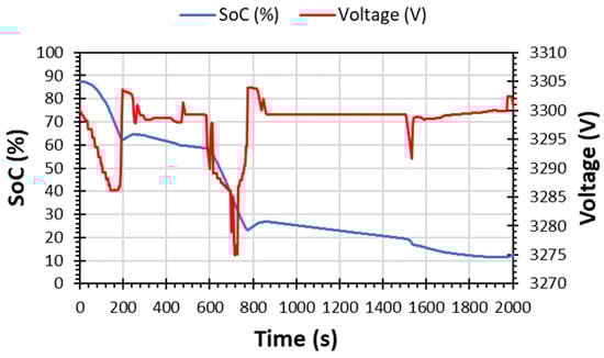 SoC of the stationary ESS and its voltage when it is located at 15 km.