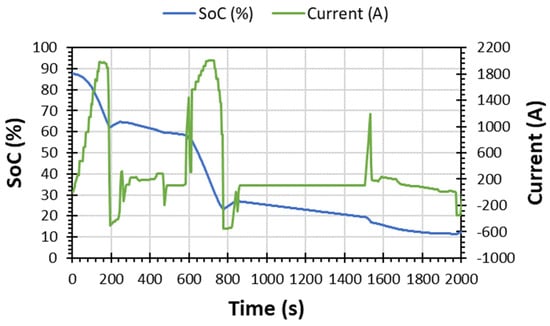 Figure 21 shows the SoC and voltage of the stationary ESS when it is located at 15 km. The figure shows that the voltage drops down when it is discharging and rises up when it is charging. Figure 22 shows the SoC and current of the stationary ESS when it is located at 15 km. The figure shows that the current is positive when it is discharging and positive when it is charging. The maximum discharging current is 2000 A while the maximum charging current is 558 A. The stationary ESS internal losses are 14.9 kWh. The discharged energy is higher than the charged energy as the ESS discharges 659.5 kWh and charges 59.5 kWh.