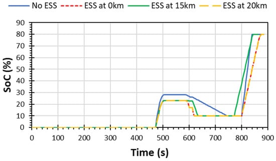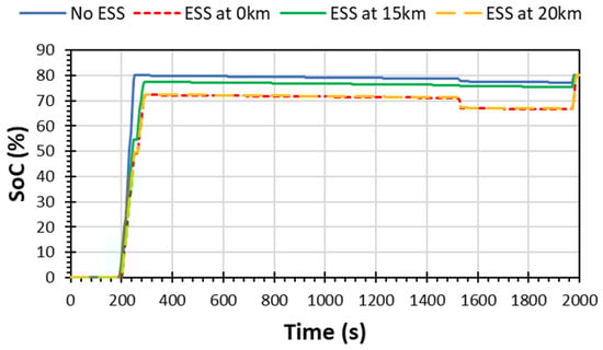 Figure 23 shows the SoC of the onboard ESS of Train 1 with respect to changing the location of the stationary ESS. The figure shows that the final SoC is 80%. The energy consumed by storage from the engine at the terminals is 55 kWh while the energy recovered from storage to the engine at the terminals is 8 kWh when there is no stationary ESS installed. The energy consumed by storage from the engine at the terminals is 52 kWh, while the energy recovered from storage to the engine at the terminals is 6 kWh when the stationary ESS is installed at 0 km, 15 km, and 20 km. Figure 24 shows the SoC of the onboard ESS of Train 2 with respect to changing the location of the stationary ESS, where it shows that the final SoC is 80%. The energy consumed by storage from the engine at the terminals is 46 kWh while the energy recovered from storage to the engine at the terminals is 0 kWh when there is no stationary ESS installed, that is the same result when the stationary ESS is installed at 15 km. The energy consumed by storage from the engine at the terminals is 48 kWh, while the energy recovered from storage to the engine at the terminals is 2 kWh when the stationary ESS is installed at 0 km and 20 km. It is concluded that the location of the stationary ESS has a negligible impact on reducing the size of the onboard ESSs.